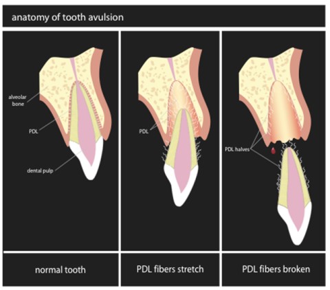 When a tooth gets knocked out, the PDL fibers break. The knocked-out tooth will inevitably need a root-canal procedure at some point, but the key to success is the first response, which should be to maintain the vitality of the remaining fibers. Chances of root resorption (breakdown or loss of root structure) and ankylosis (fusion of the tooth to the bone) will decrease if the tooth can be re-implanted in the socket properly and in a timely manner.