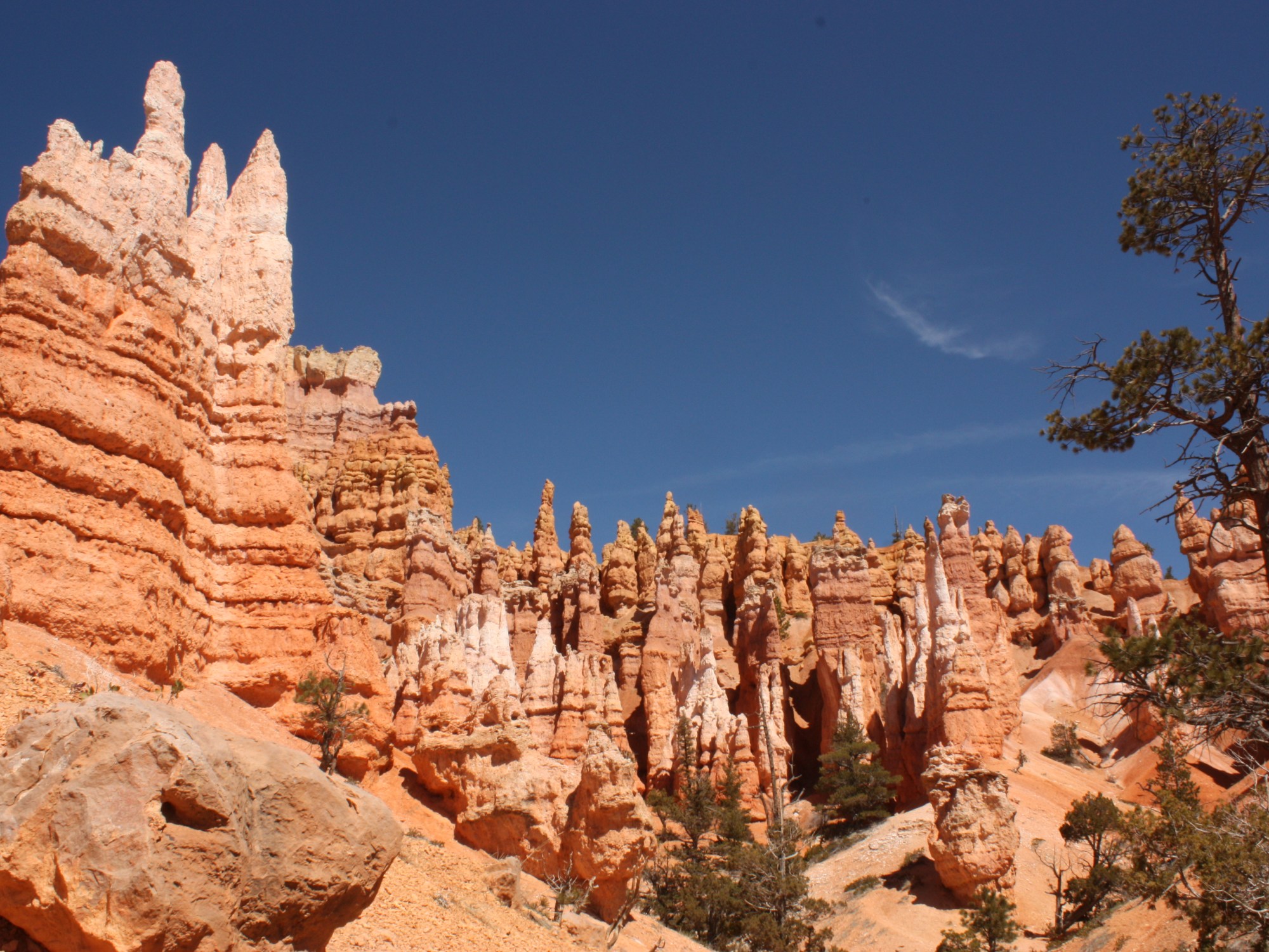 The Canyon has no shortage of fantastic scenery. Viewing the peculiar formations of rock shapes from the canyon rim is a remarkable experience, but to really enjoy this fantasyland, you need to hike down below the rim. Queen’s Garden Trail from Sunrise Point is where your imagination can run wild. You hike alongside bizarre rock shapes known as “hoodoos,” which have been eroded from a thick layer of soft, sedimentary rock deposited over 60 million years ago. From Sunset Point, you can look down to Bryce Amphitheater, where the highest concentrations of hoodoos are found.
