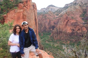 There are many flat and easy trails in the Zion NP. There are strenuous uphill climbs and dangerous trails that require special preparation and equipment. Hikes can be 10 minutes, all day, or a backpacking trip. You have to take stock of your physical and mental fitness level in choosing a trail. If you can’t handle a thousand foot drop on both sides of the trail, with a trail only three feet wide, pulling yourself up the incline with a chain railing, avoid Angel’s Landing Trail. On a side note, Dharmesh, my husband was the only one finished the Angels’ Landing Trail during our trip, partly because of the stormy day with high wind and rain made the trail very dangerous to hike on the last part and rest of us decided not to take the risk.