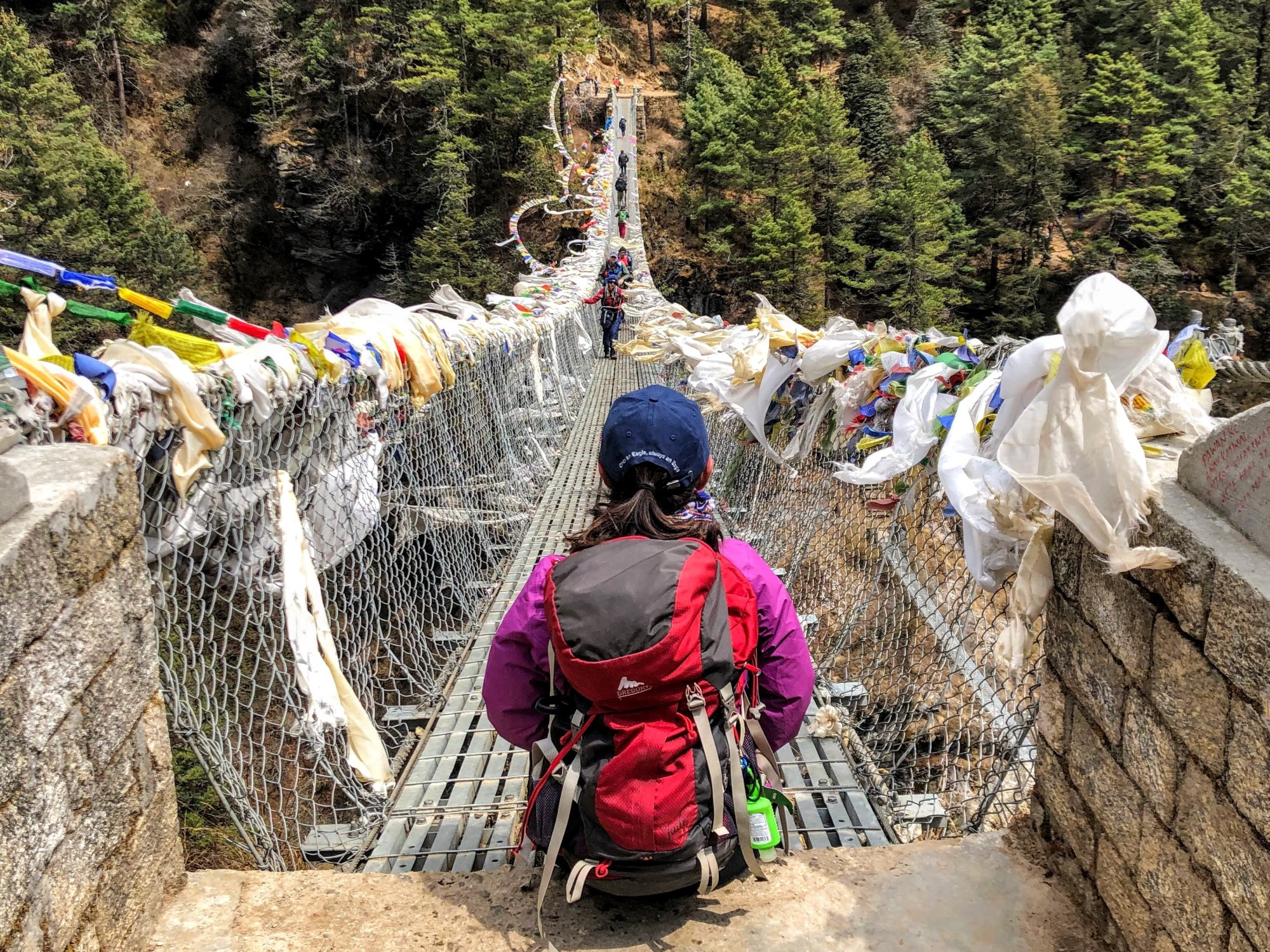 The day hike to Namche is one of the longest and toughest ones. The trail is steep and the elevation gain is quite a bit. The fun part is that you get to criss cross over many suspension bridges, including the most iconic one, called Hilary Bridge, which hangs high above the old bridge.