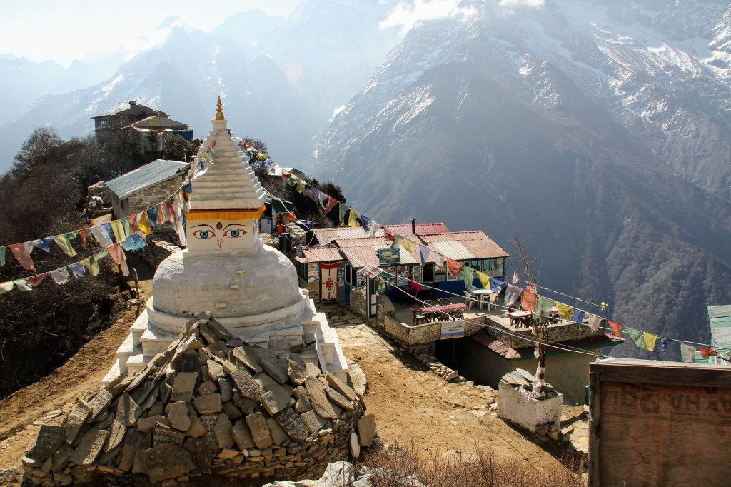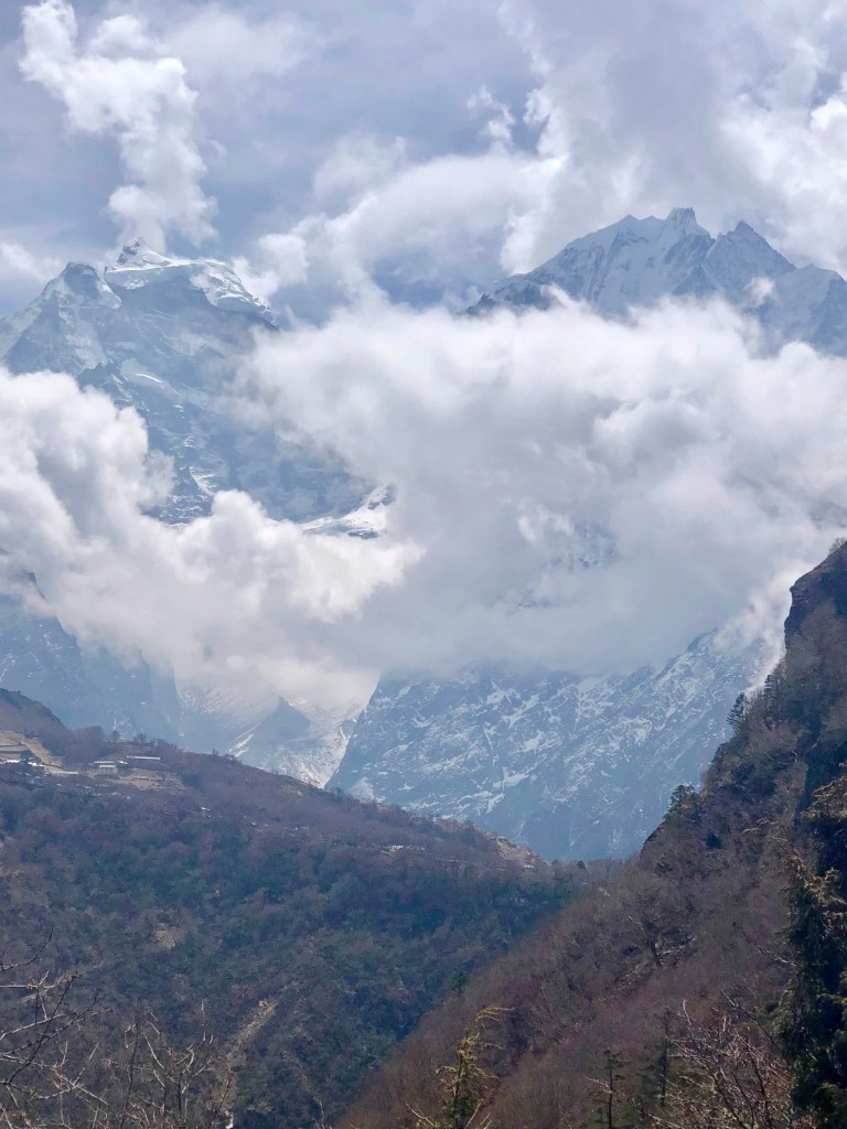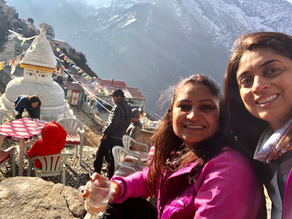 We woke up with a beautiful view of the sunrise overlooking the stupa and Thamserku Mountain. Today’s hike was supposed to be a short one, which allowed us to have relaxed morning chai on the outside patio of our lodge. The Facility at Snow Valley Lodge was very basic but the small town had its own calming vibe, and great views, which made up for it all!
