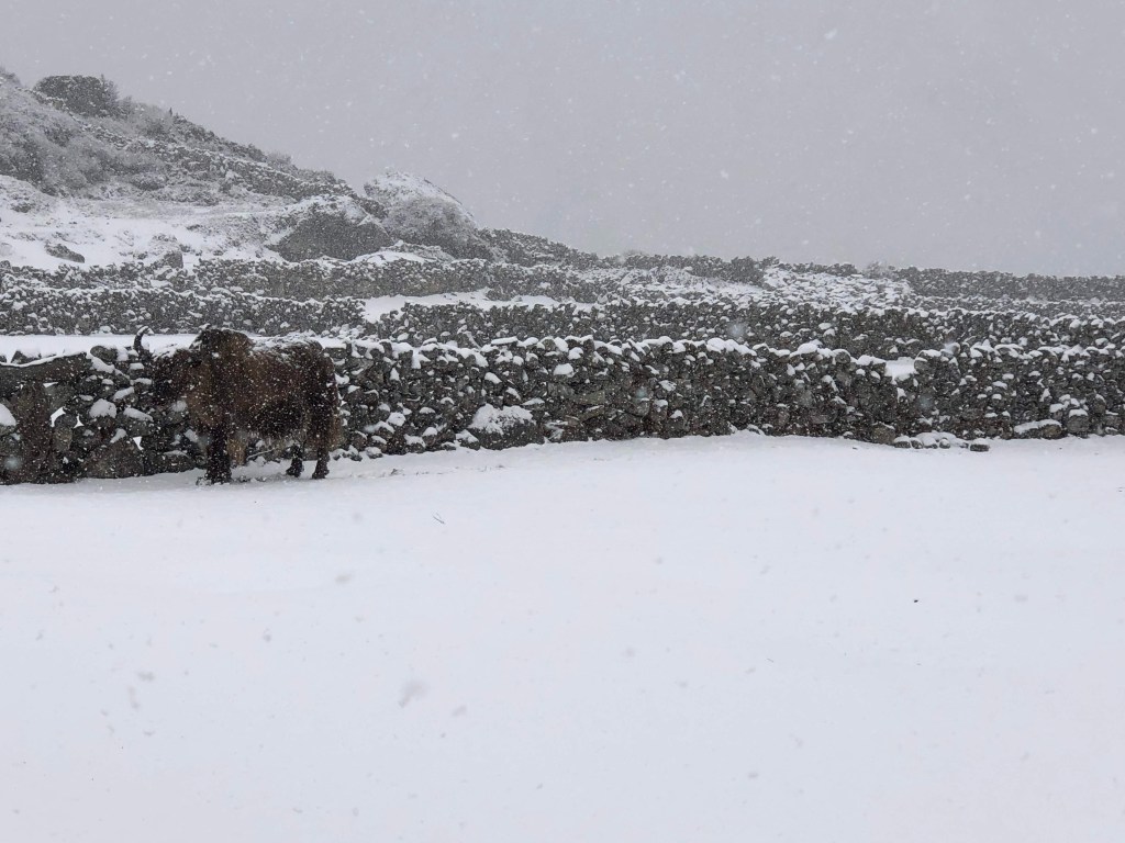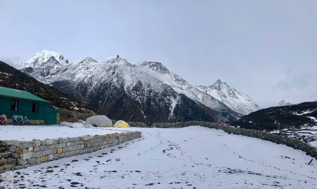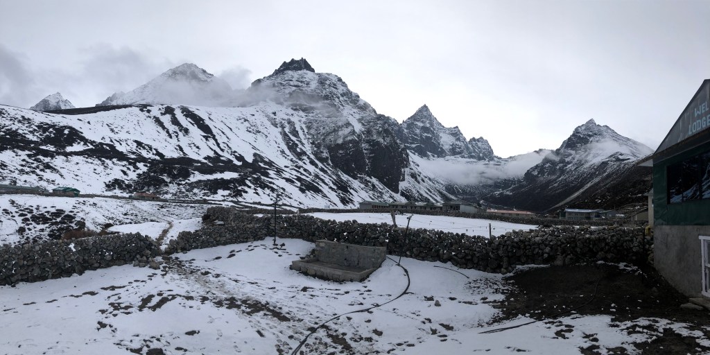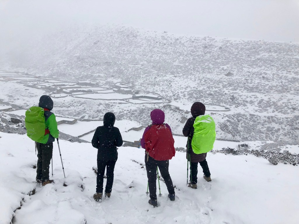 Todays’ walk was supposed to be a short one, 3-4 hours. We started at 8.30 am. The hike started with a steep uphill climb for the first 45 minutes. Soon we passed the treeline as we entered Gokyo Valley. We passed several villages along the way. Snow showers started after an hour.