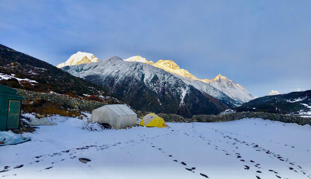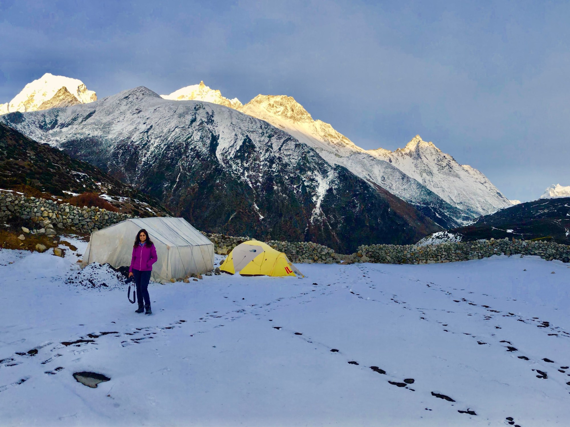 We returned around 4.30 pm, this is when the sky got absolutely clear and it opened panoramic views of the surrounding mountain peaks. Views of Tauche, Phortse, Kangtega and Thamserku was on one side and Machhermo Peak stood tall right across on the west! We witnessed one of the most stunning sunsets, all the peaks lit golden as the sun set behind Machhermo Peak. I rushed out with my camera to capture the magic! What a grand finale of another adventurous day in the Himalayan mountains.
