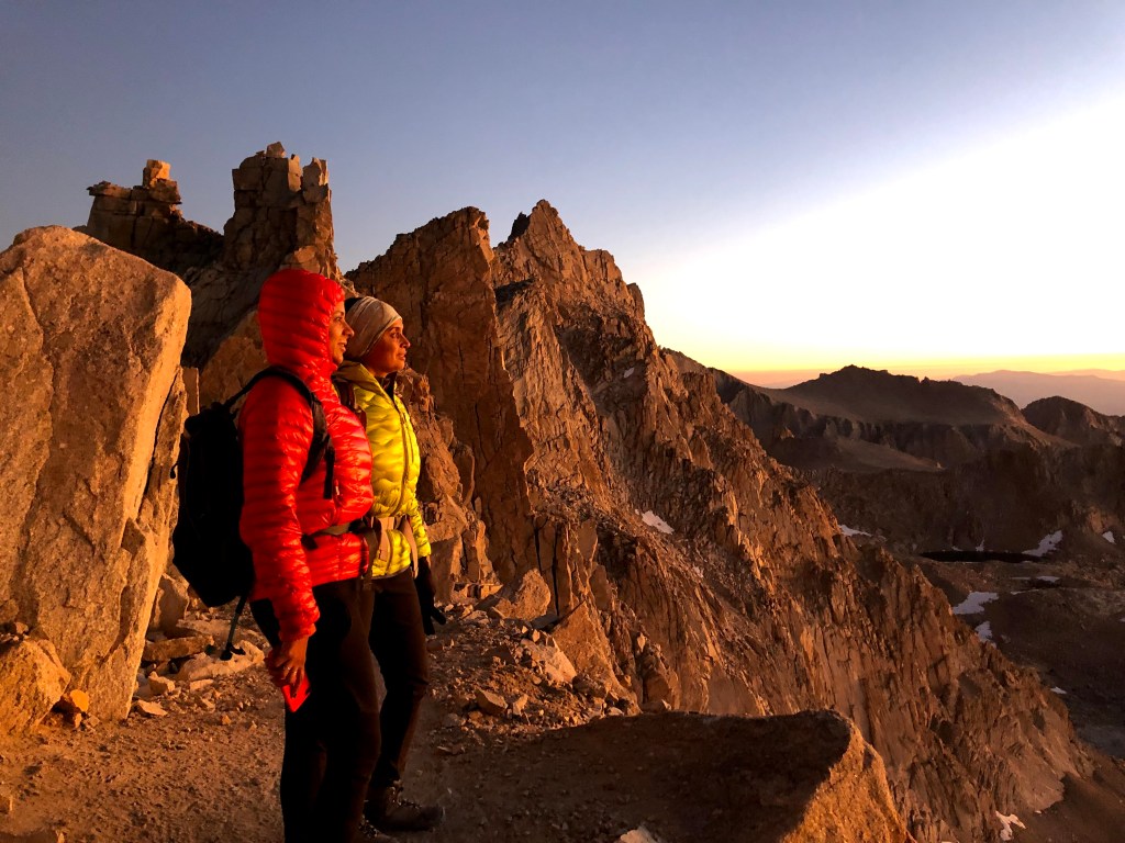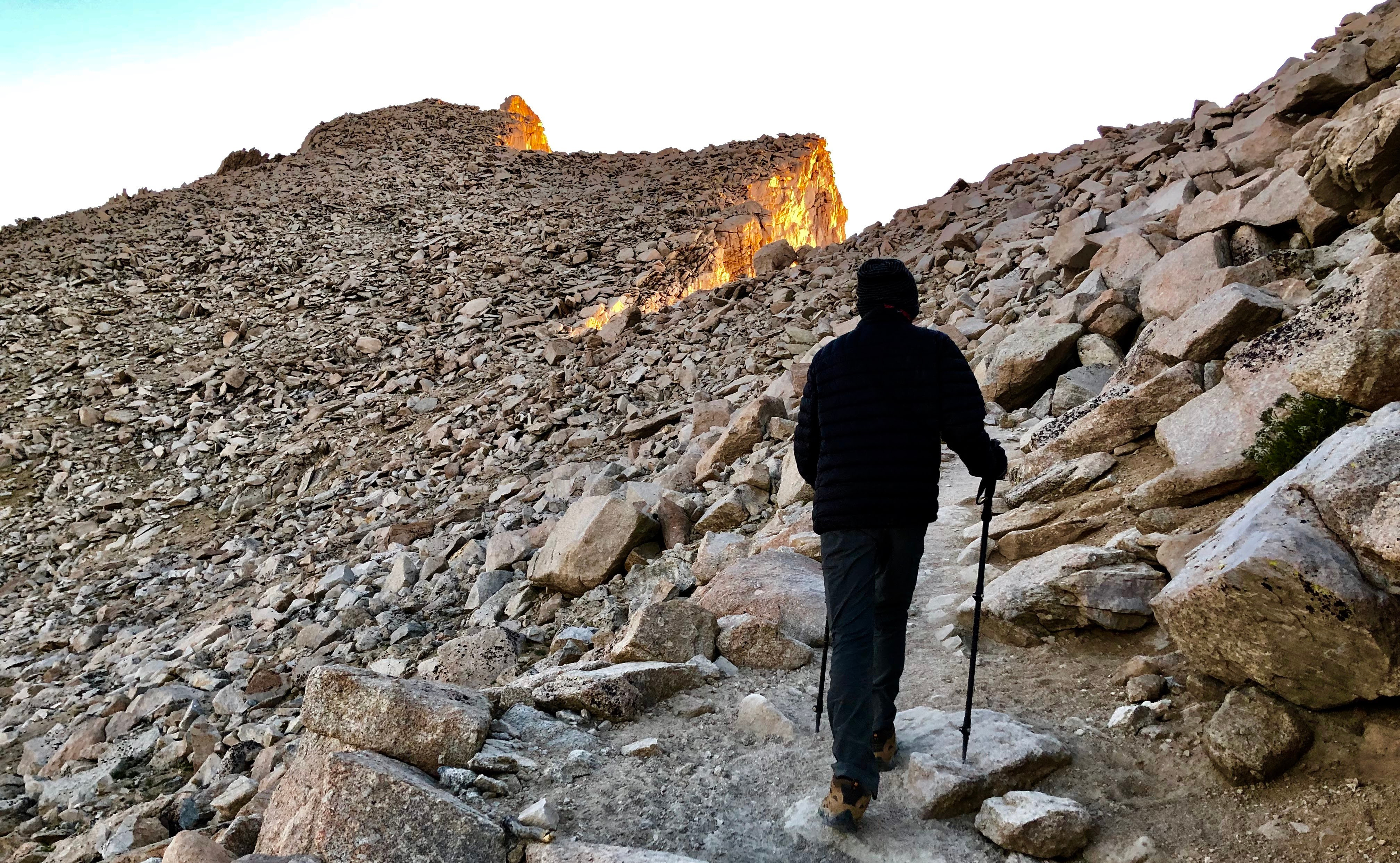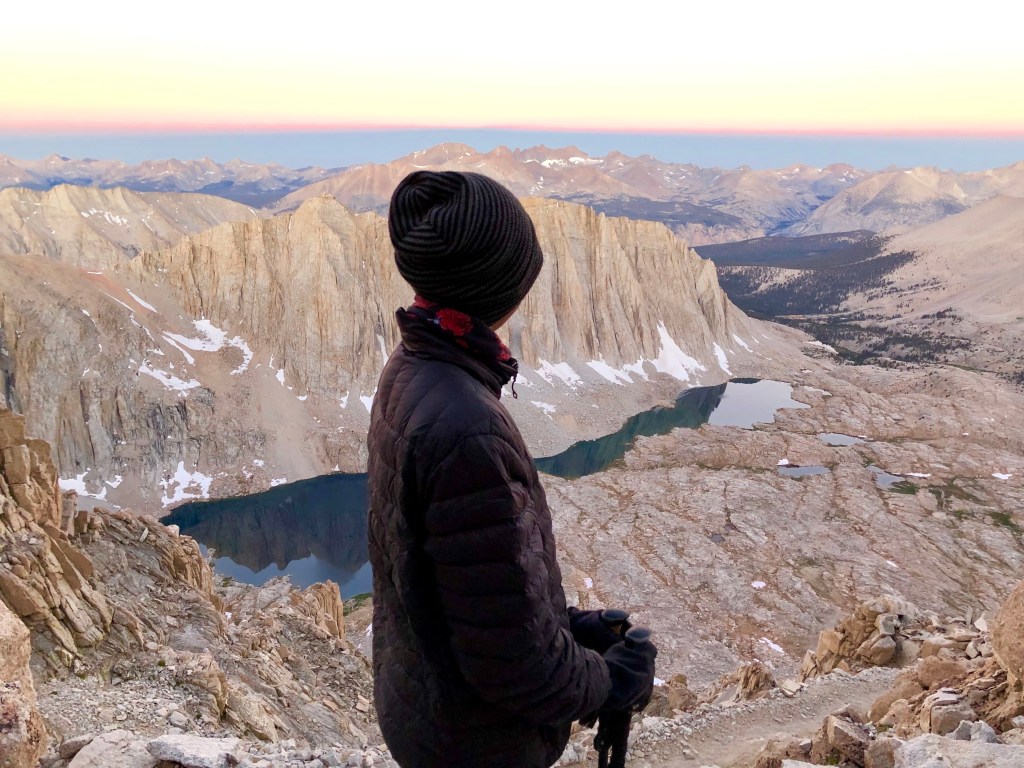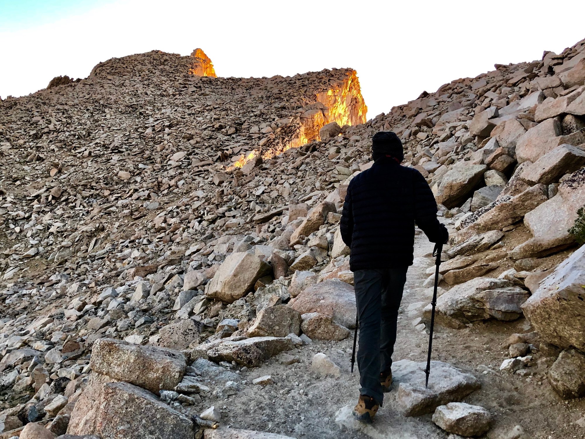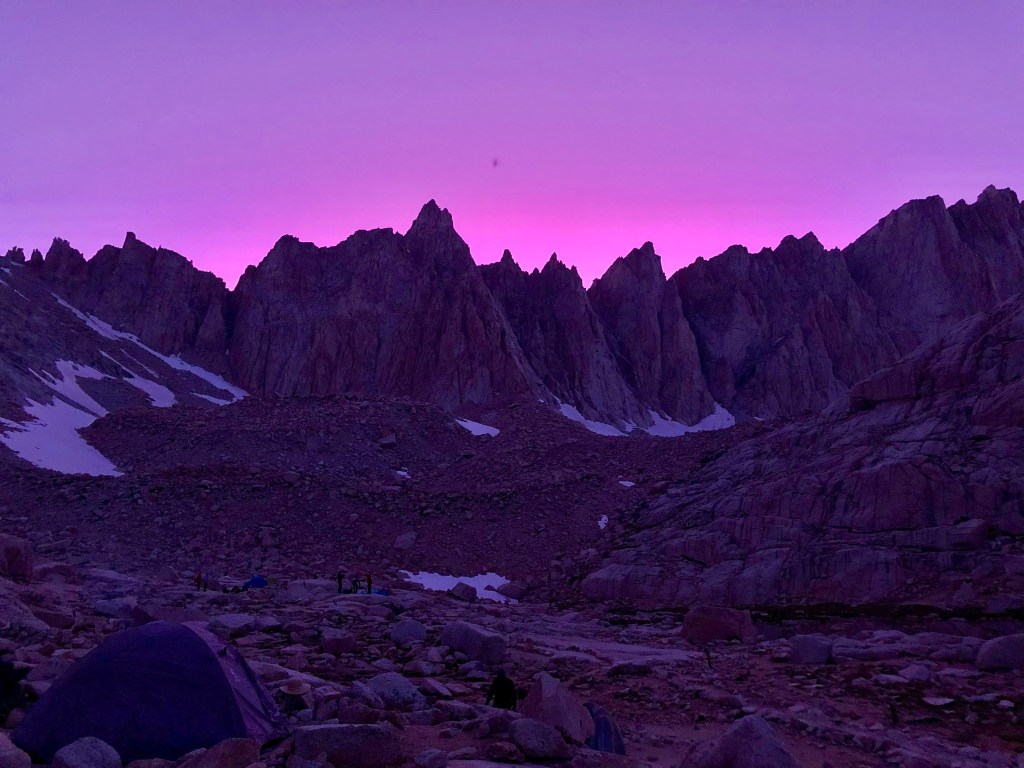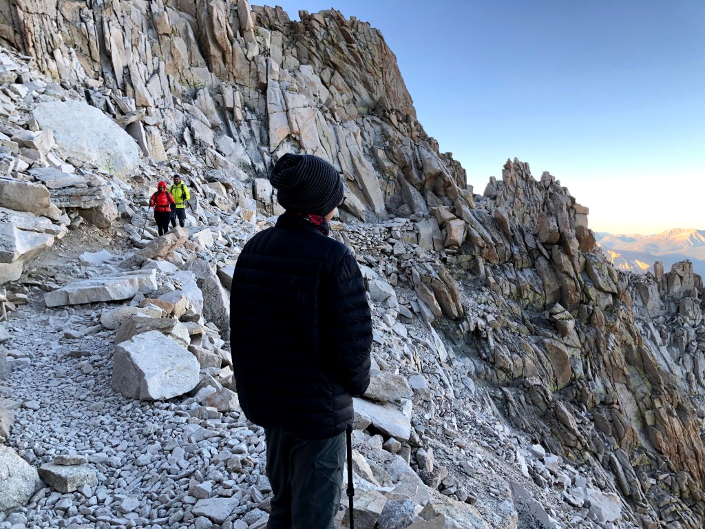 We started hiking around 3.40ish. It was a beautiful dark starry night. The first three miles were famous `99 switchbacks’. We were doing well today, mainly because we were acclimated from spending a night at 12000 ft. The darkness kept us off from the distractions and made it easier to keep climbing. We started seeing more and more trails of headlamps around 5 am. We were almost to the top of the ridge when the day started breaking in. The shadow of tall needles on the right side made us feel tiny. We got excited about the sunrise and hoped that we would make to the top of the trail crest to watch the sunrise.
