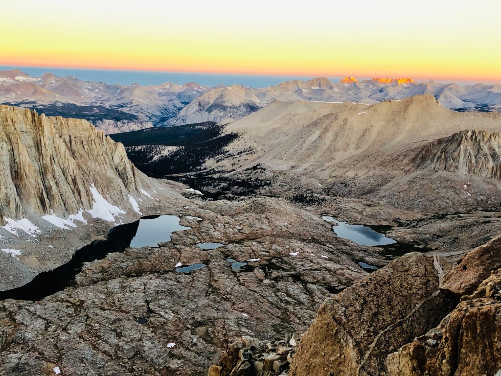 We passed the JMT junction and started walking along the cliffside. We started meeting more JMT hikers coming from Guitar Lake up. The views on the west were breathtaking. There are these constant mesmerizing views of Hitchcock Lakes and Guitar Lakes with the dramatic backdrop of high sierras were priceless. 20 minutes in, the first rays of sun painted the tips of the mountain with a bright golden color. This scene is hard to describe and was impossible to capture in camera. We took a break and just kept on watching the unbelievable scene.