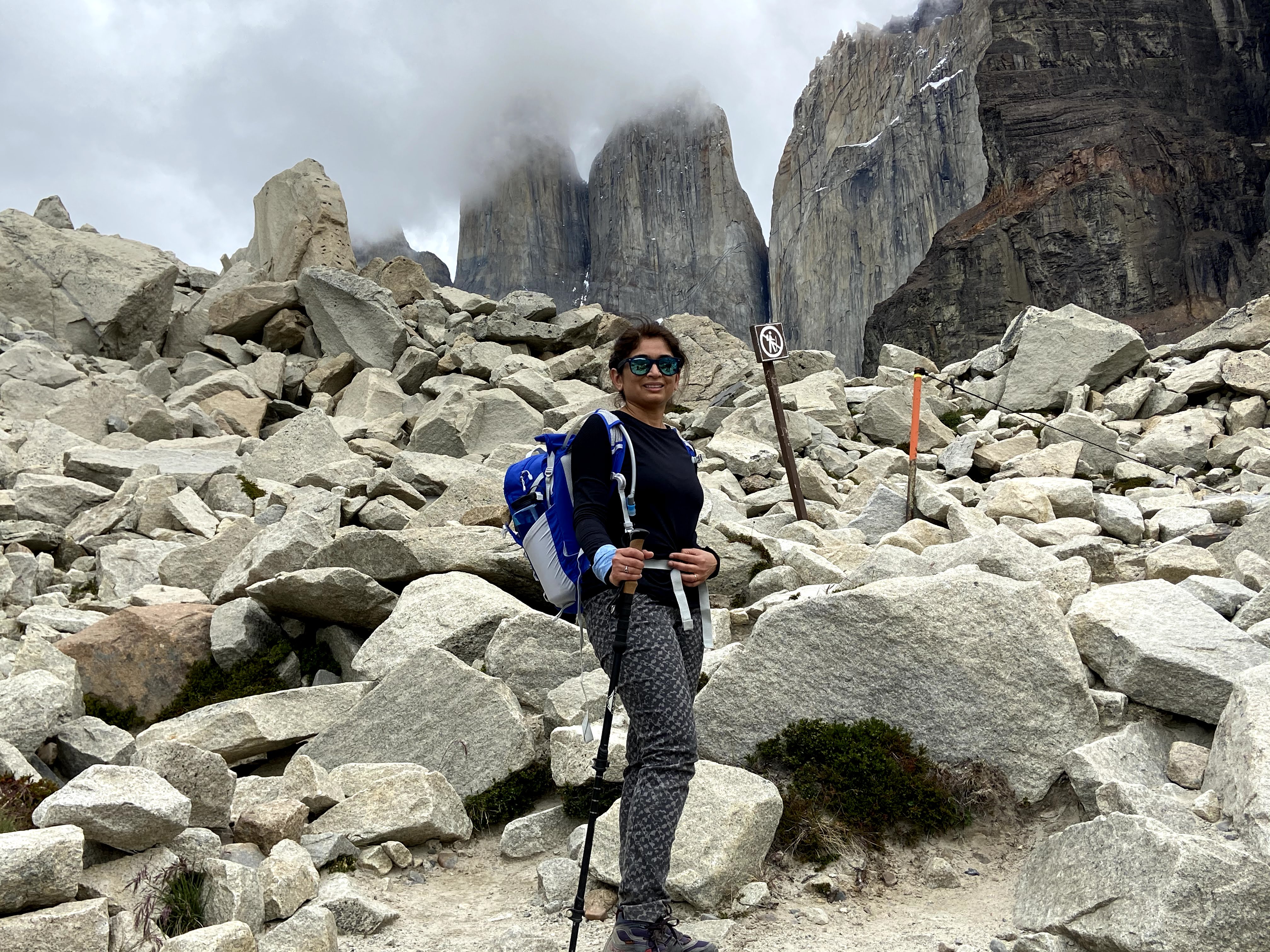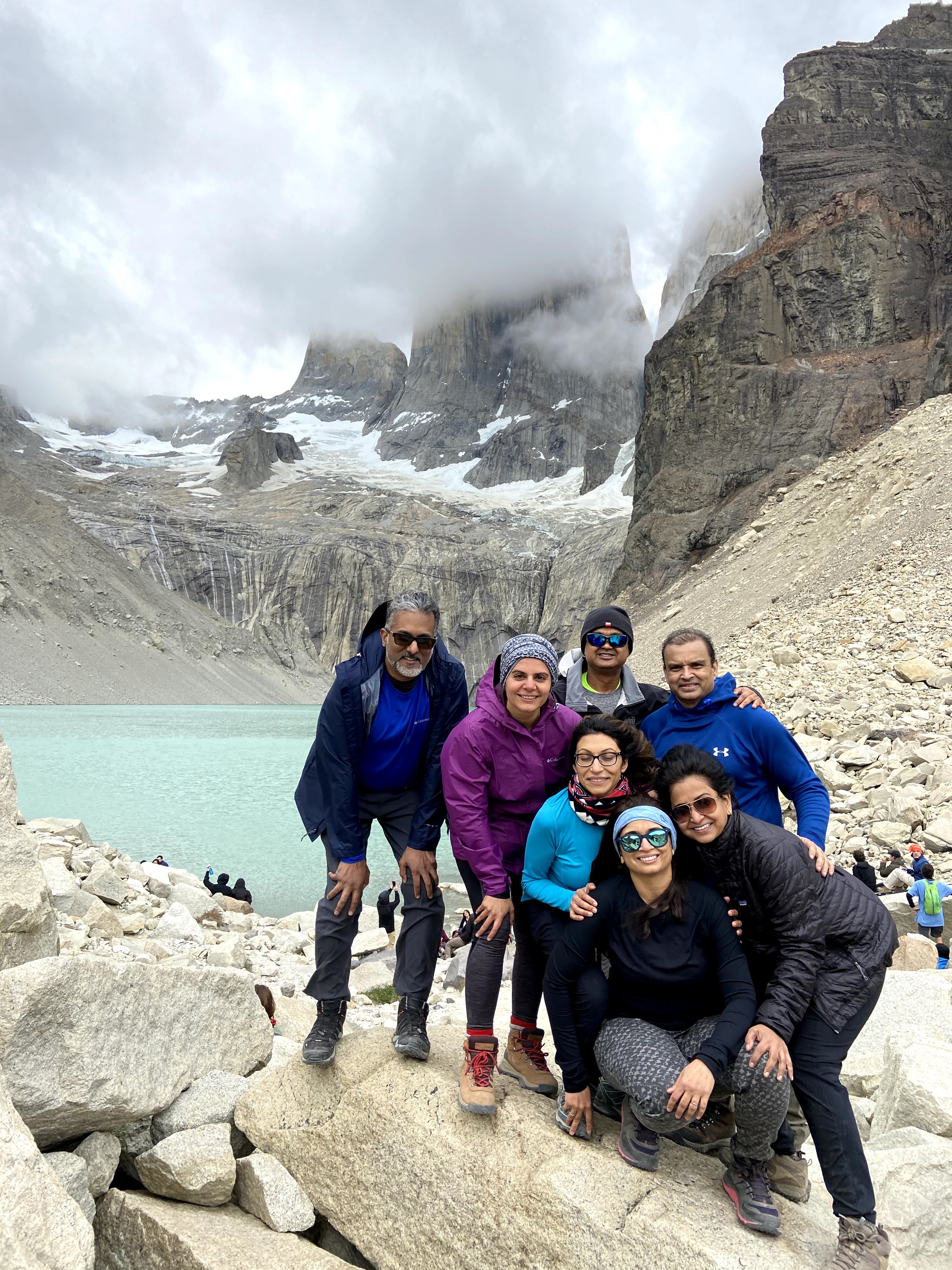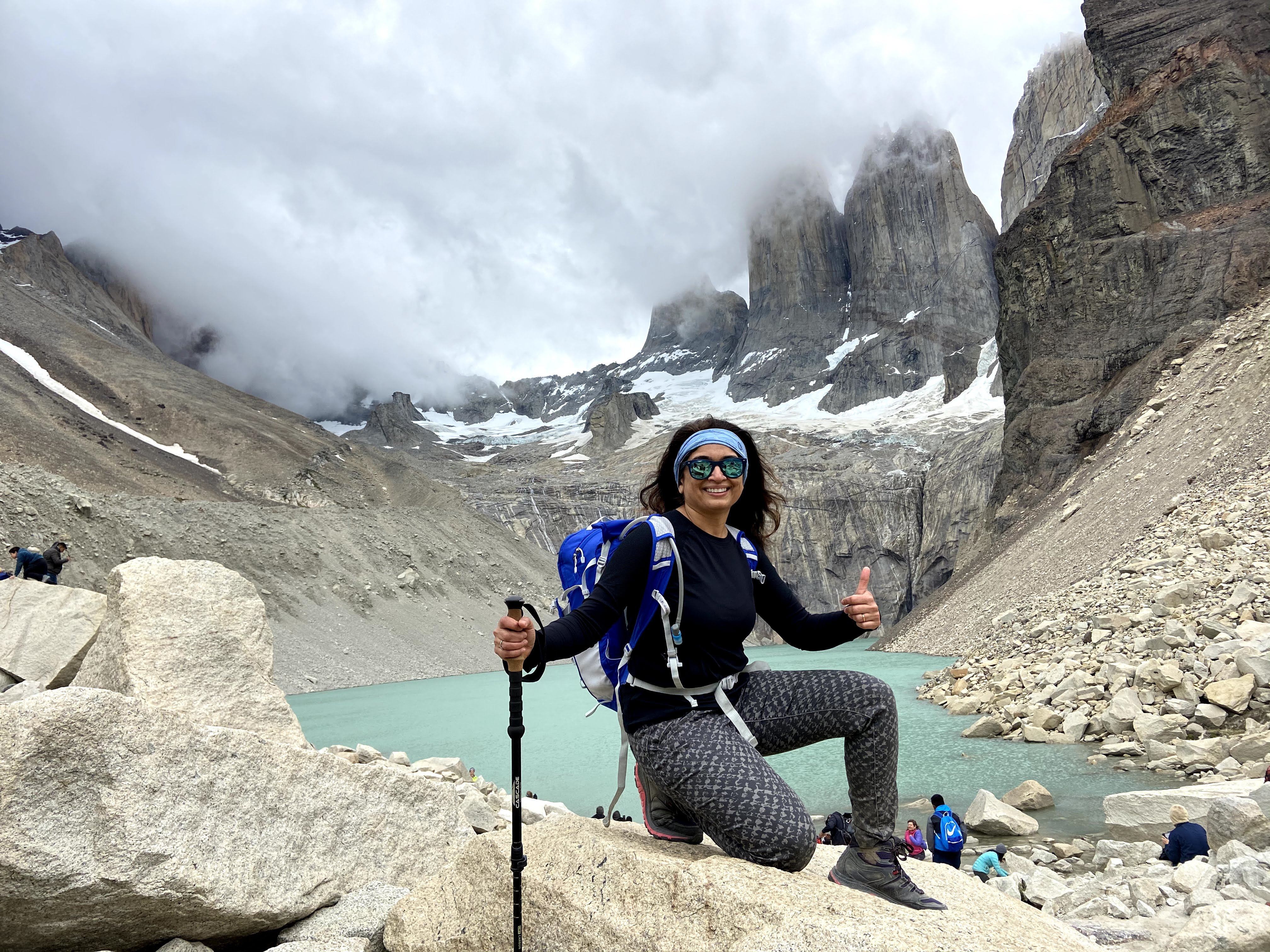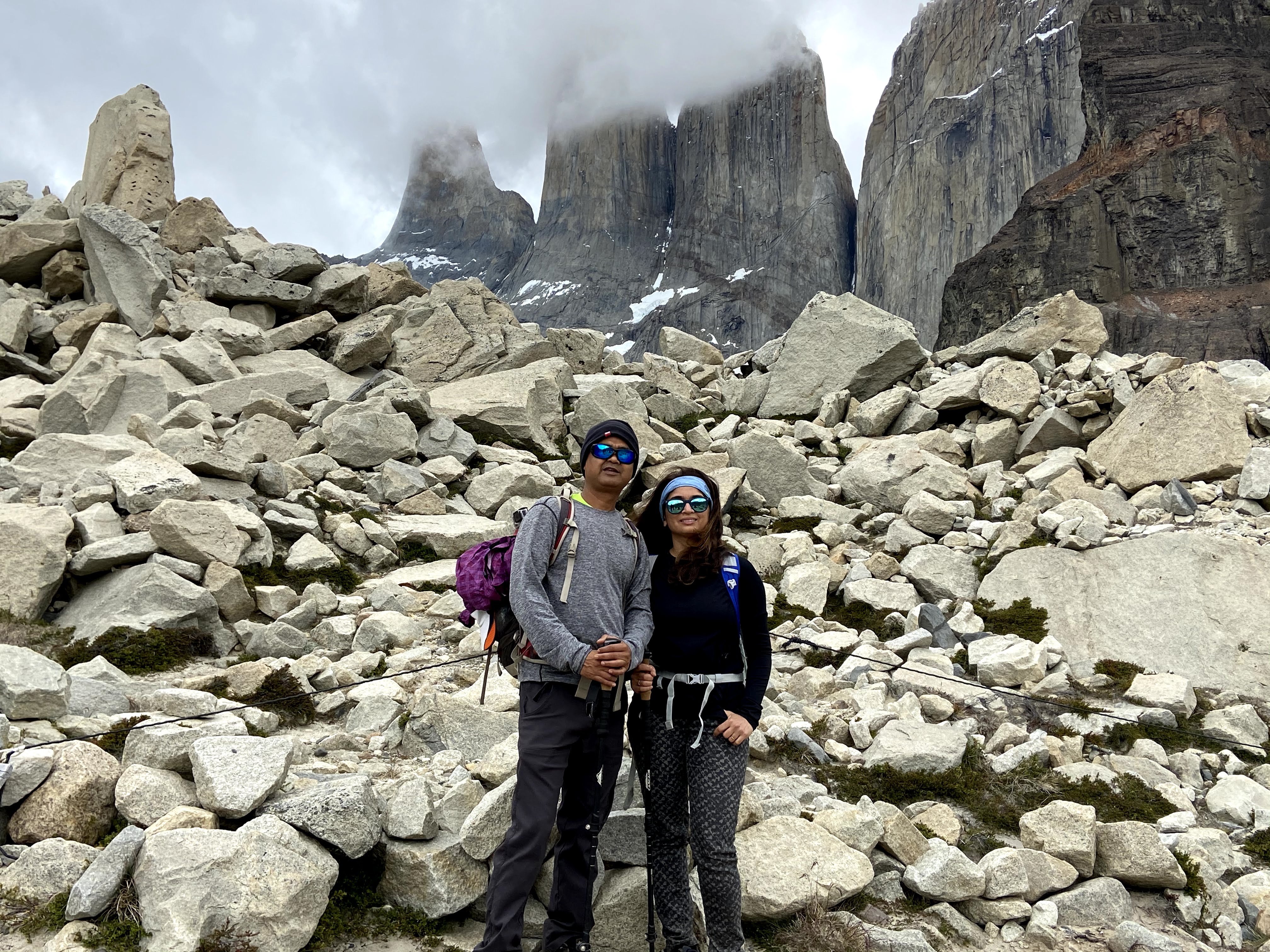 This was supposed to be the toughest part of the hike. The steep slope up on loose gravels seemed never-ending, it started getting tiring at this point. After an hour or so, the towers came to the clearer view, and in another 20 minutes, we finally stood in front of the aquamarine lake precisely at the base of the Paine Towers.