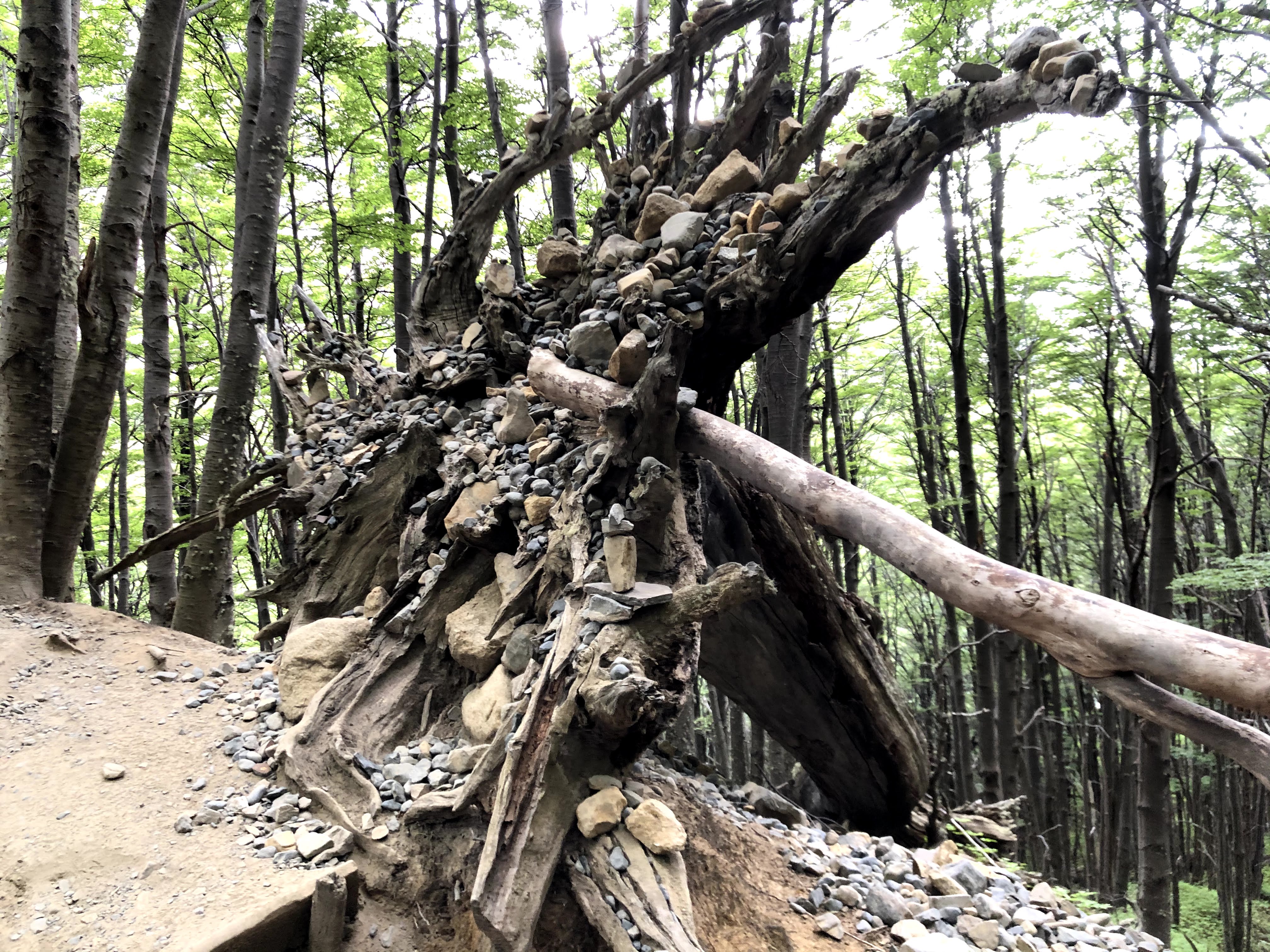 After a couple of hours, we entered a lush forest. We kept on gaining some gentle elevation, as we walked into the forests next to the river. After several hours of walking, we stood in front of a huge pile of loose rocks where the forest ended.