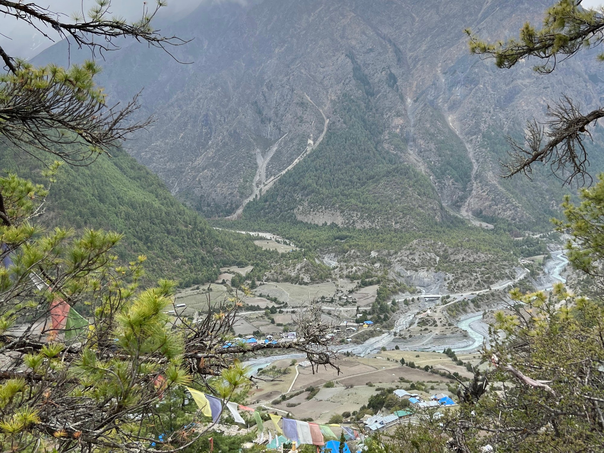 3 helicopters took us to Lower Pisang via 50 minutes of breathtaking journey following the river bed between souring Himalayan Peaks.