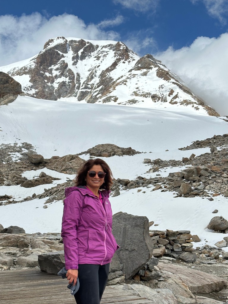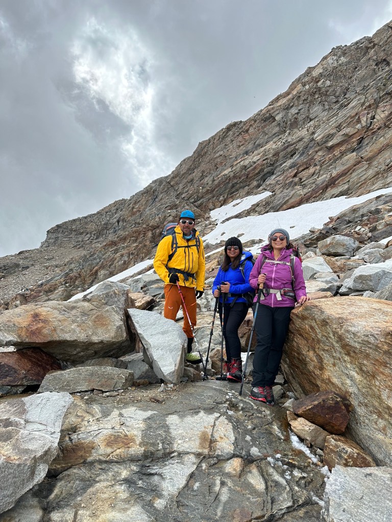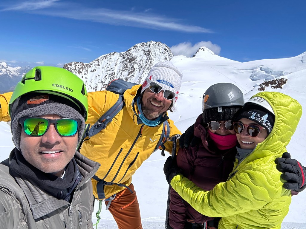 Our traverse across the massif offered mesmerizing views of the Matterhorn and Vincent Pyramid. The challenging ascent of Mount Ludwigshoehe at 4342 meters tested our mettle, but we emerged victorious. Our journey continued with the ascent of Balmenhorn at 4167 meters, featuring a technically demanding final section. Mitul boldly faced this challenge, while Hetal and I admired the scenery from the base.