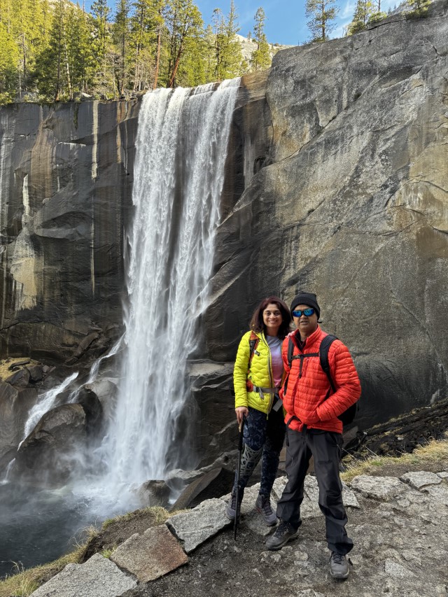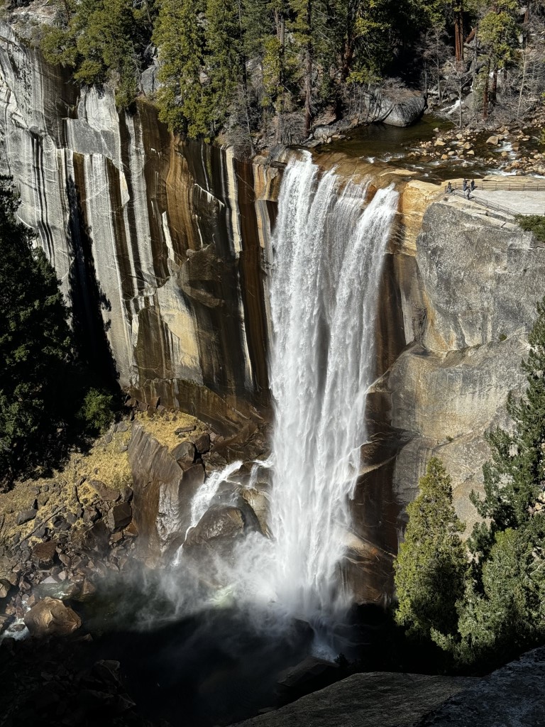 We paused at the top of Vernal Falls to witness the force of nature. As we climbed higher, the surrounding landscape transformed, revealing towering granite cliffs and lush greenery punctuated by patches of lingering snow.