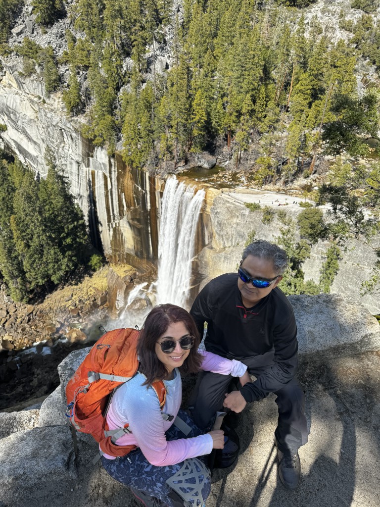 The journey began on the mist trail, alongside the roaring Merced River. With gentle ascent, each step brought us closer to Vernal Falls, its powerful waters sending refreshing sprays to cool our exertion. After the footbridge, we continued on Mist Trail with steep scramble alongside cascading Vernal fall.