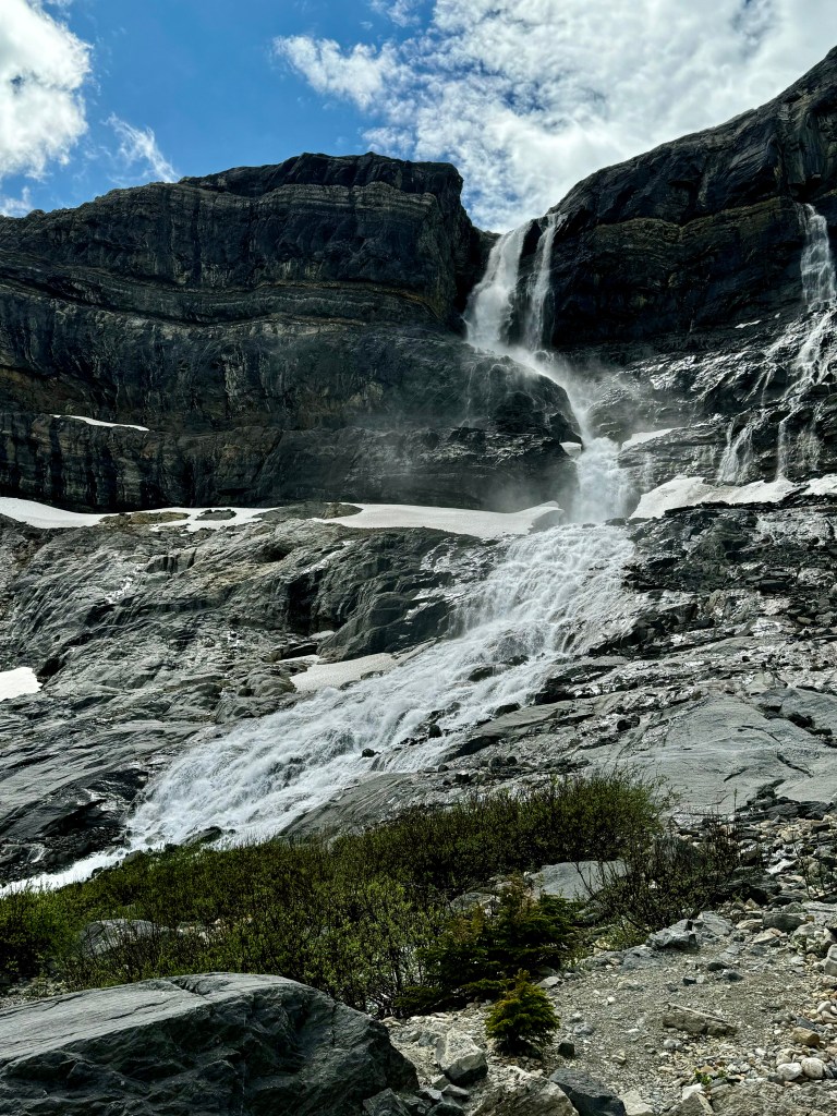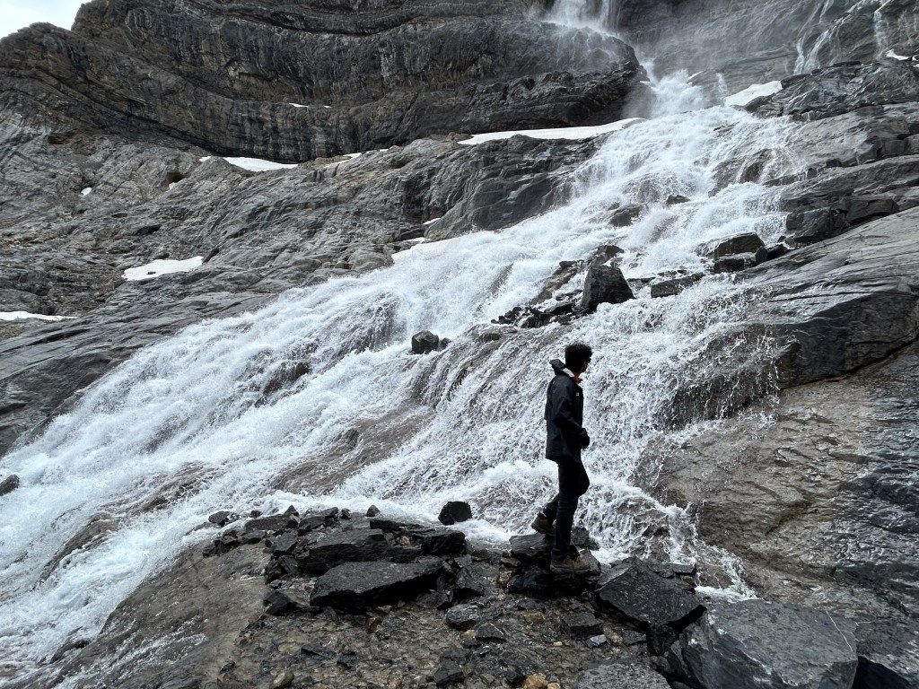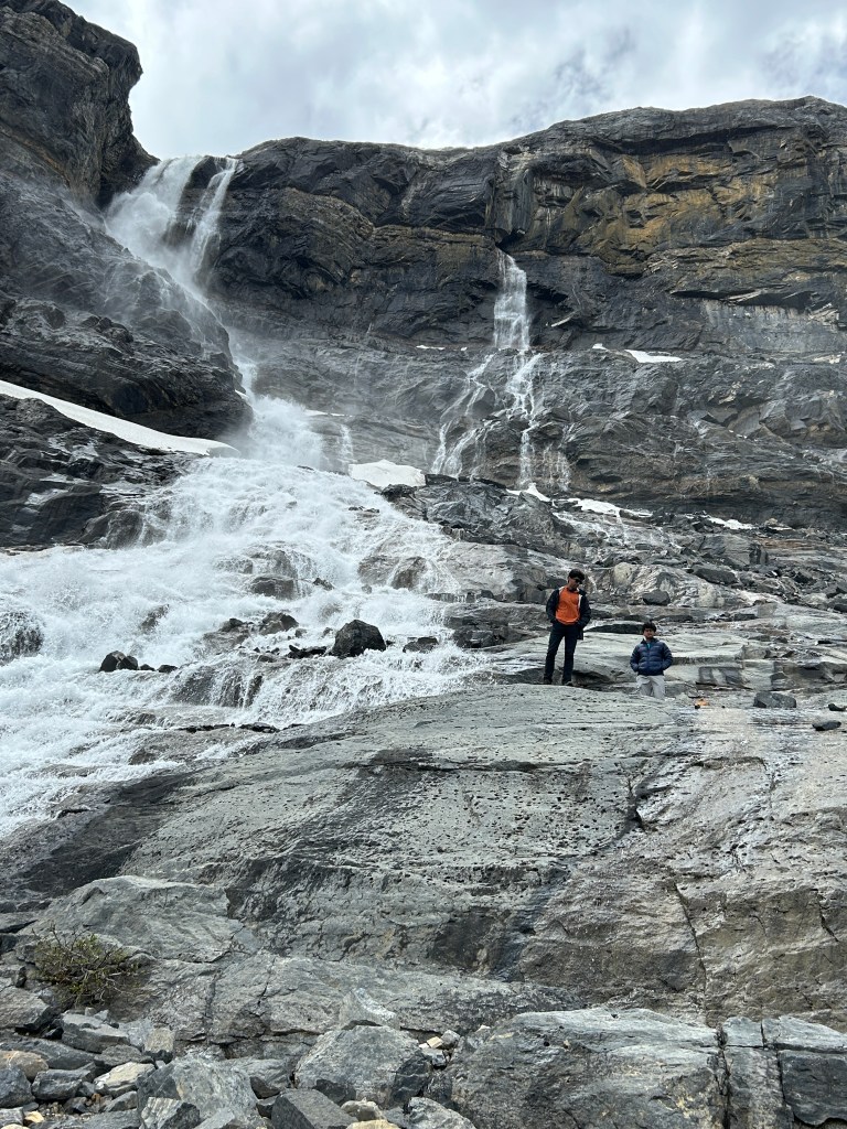 Finally, we reached Bow Glacier Falls, cascading down from the glacier above. The sound of the water rushing down the rocks was intense and incredibly refreshing after the climb. Standing so close to the falls, with mist spraying all around, made us feel like we were in a hidden part of the Rockies that not everyone gets to see.