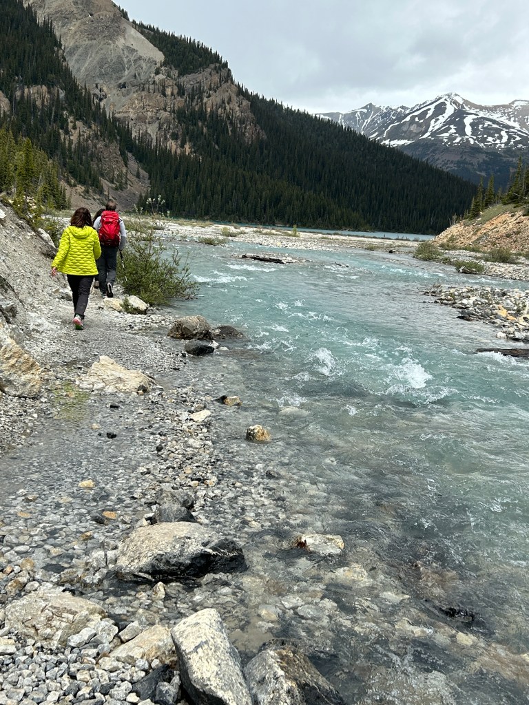 After crossing the delta, the trail starts to climb and gets a bit rockier. Here, we were surrounded by rugged mountains and the bright blue of Bow Lake below. The higher we went, the more we could feel the power of the landscape around us.