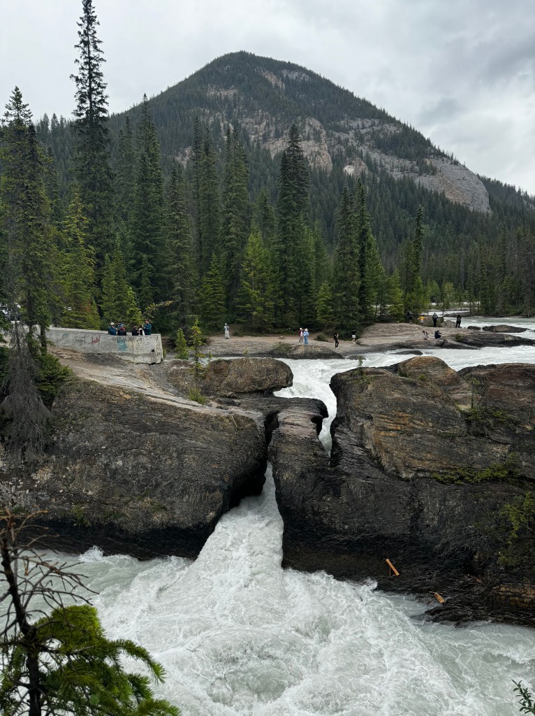 Next, we made our way to Natural Bridge, a fascinating rock formation shaped by the Kicking Horse River. The rushing water has carved through the rock over time, creating a “bridge” that you can view from different angles. It’s an easy stop with great photo ops, and the contrast of the whitewater against the dark rock made it extra memorable.