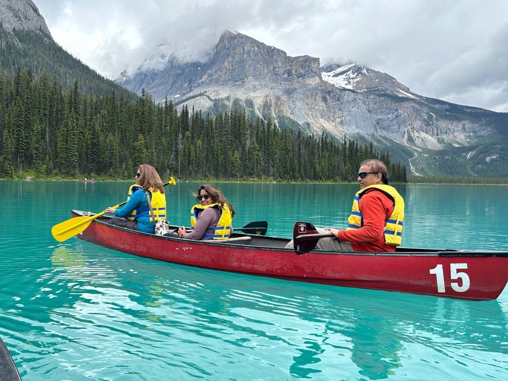 We then headed over to Emerald Lake, which is famous for its striking green-blue color. We couldn’t resist the chance to get out on the water, so we rented a canoe and paddled around the lake, surrounded by mountains and evergreens. Canoeing on Emerald Lake was peaceful and gave us a whole new perspective of the lake’s beauty, especially with the glacial waters shimmering around us.